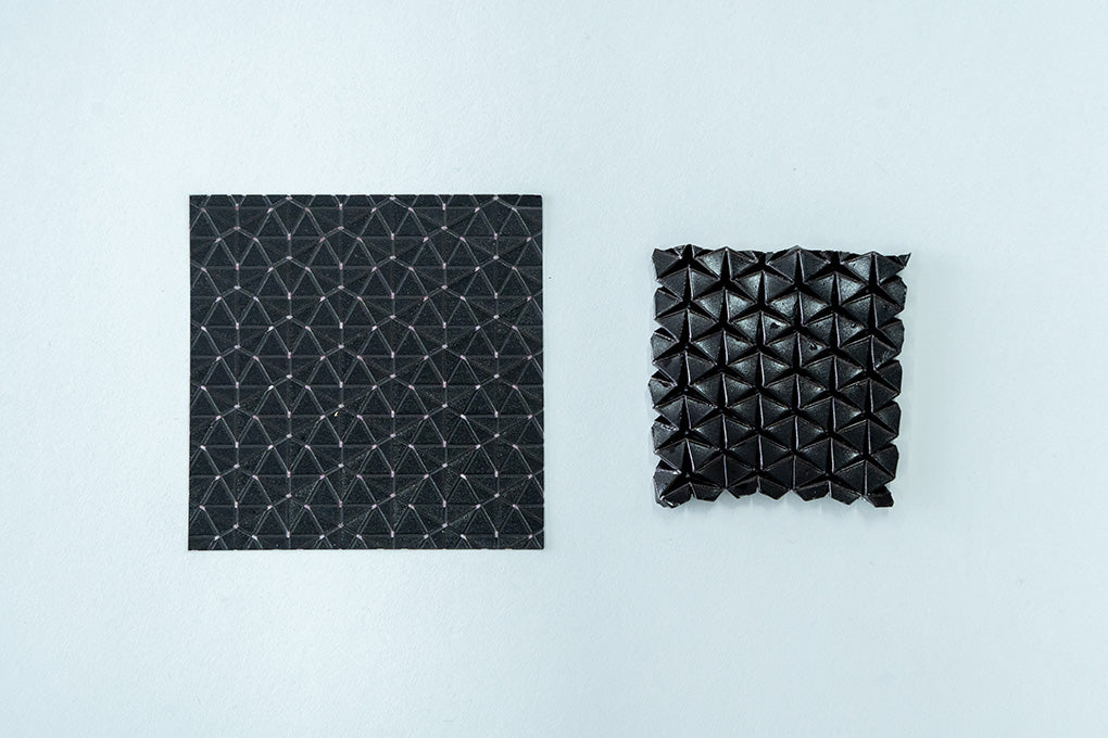 An origami sheet designed using Inkjet 4D Print (left). This sheet is “self-folding”, autonomously folding complex origami structures with more than 100,000 fold lines and several thousands of sides. Simply heating it to approximately 70–100°C causes it to transform into the intended three-dimensional form (right).