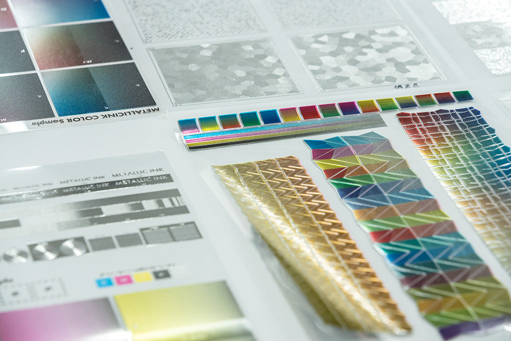 Samples of sheets produced using high-brightness metallic inkjet technology. By combining FUJIFILM’s unique dispersion technology with inkjet printing, metallic expressions with higher brightness than conventional methods are achieved.