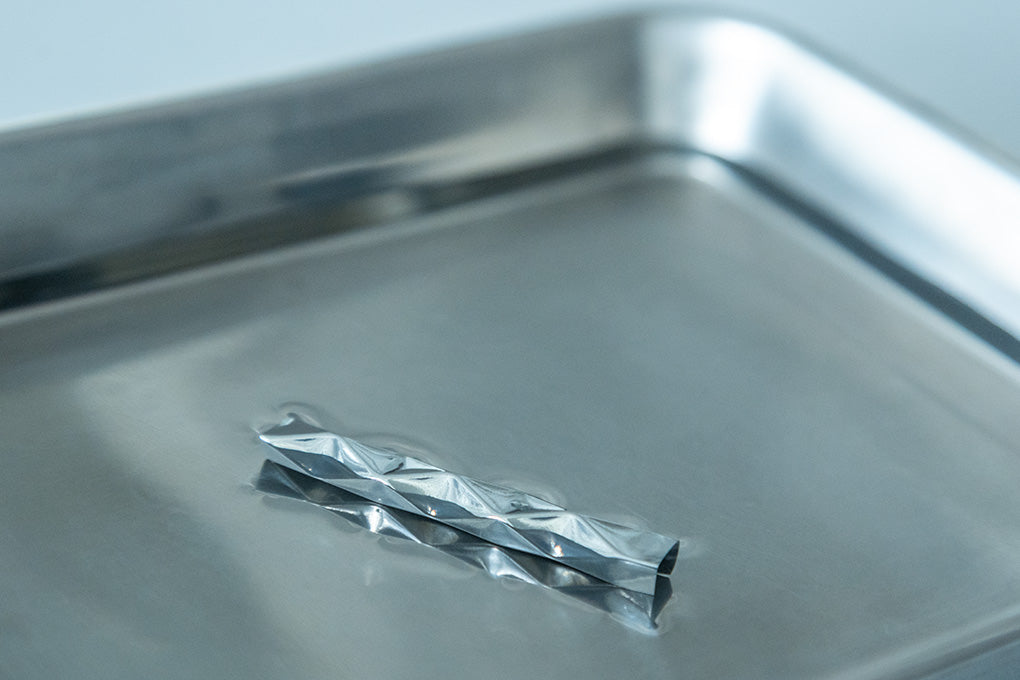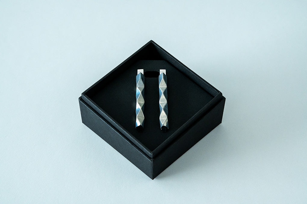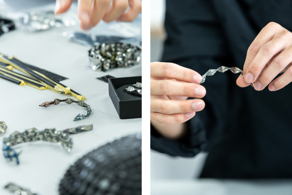 In 2024, at an exhibition in Paris, we presented an installation that showed the process during which a flat sheet transforms into a three-dimensional form and is elevated into an accessory. What we produced at that time were not earrings, but bangles. However, with bangles, unforeseen physical damage can occur in everyday life, such as knocking them against a table. When we thought about creating something that could be used for many years, we decided to shift our focus to earrings, which are not directly subjected to external forces on the product itself. That process ultimately led us to the current form.