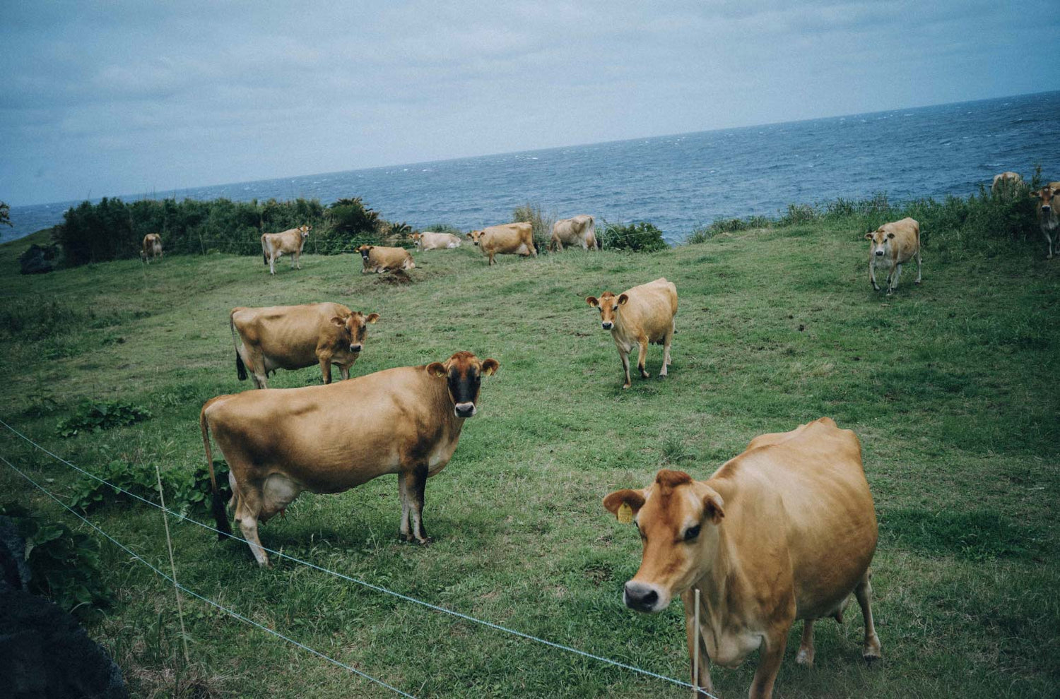 Forty or so Jersey cows grazed in the morning ocean air. Local farmer Uotani came to Hachijōjima in 2013. The cows eat the local vegetation, and from their milk he produces mozzarella and other fresh cheeses, yogurt and pudding. As an avid researcher, he studied the history of the island in the archives at Stanford University, and spoke at length about the present and future for the ranch, and the history of dairy farming on Hachijōjima.
