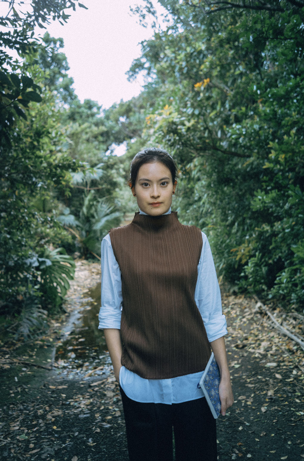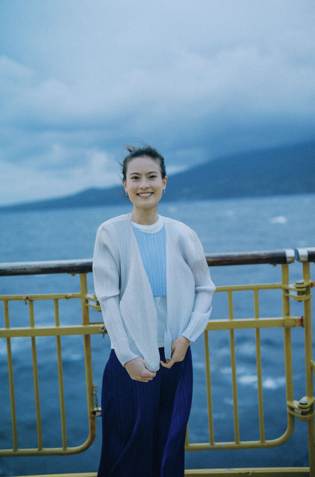 “The winds are strong and bring the fragrance of the sea. The island has a unique climate, and the long-sleeved shirt, brown top and black bottoms were the perfect combination for it.