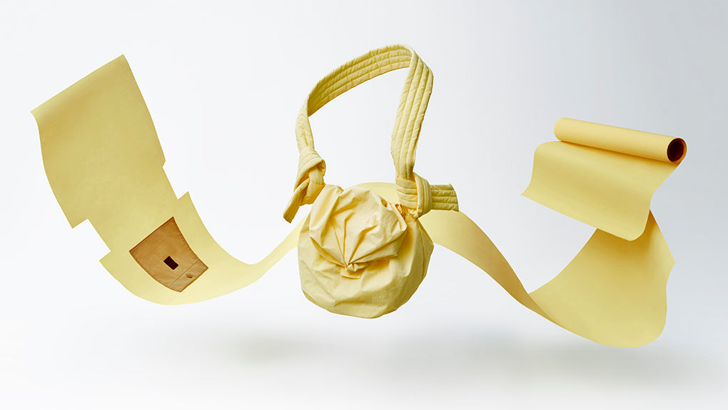 A bag featuring an appealing soft, light material and shape that makes you unconsciously want to touch it. The design is simple but well-calculated, consisting of a single rectangular piece of fabric that is twisted and sewn together. The pattern, which utilizes every bit of the fabric for the parts and creates zero waste, is inspired by Japanese noragi work clothing and monpe work pants.