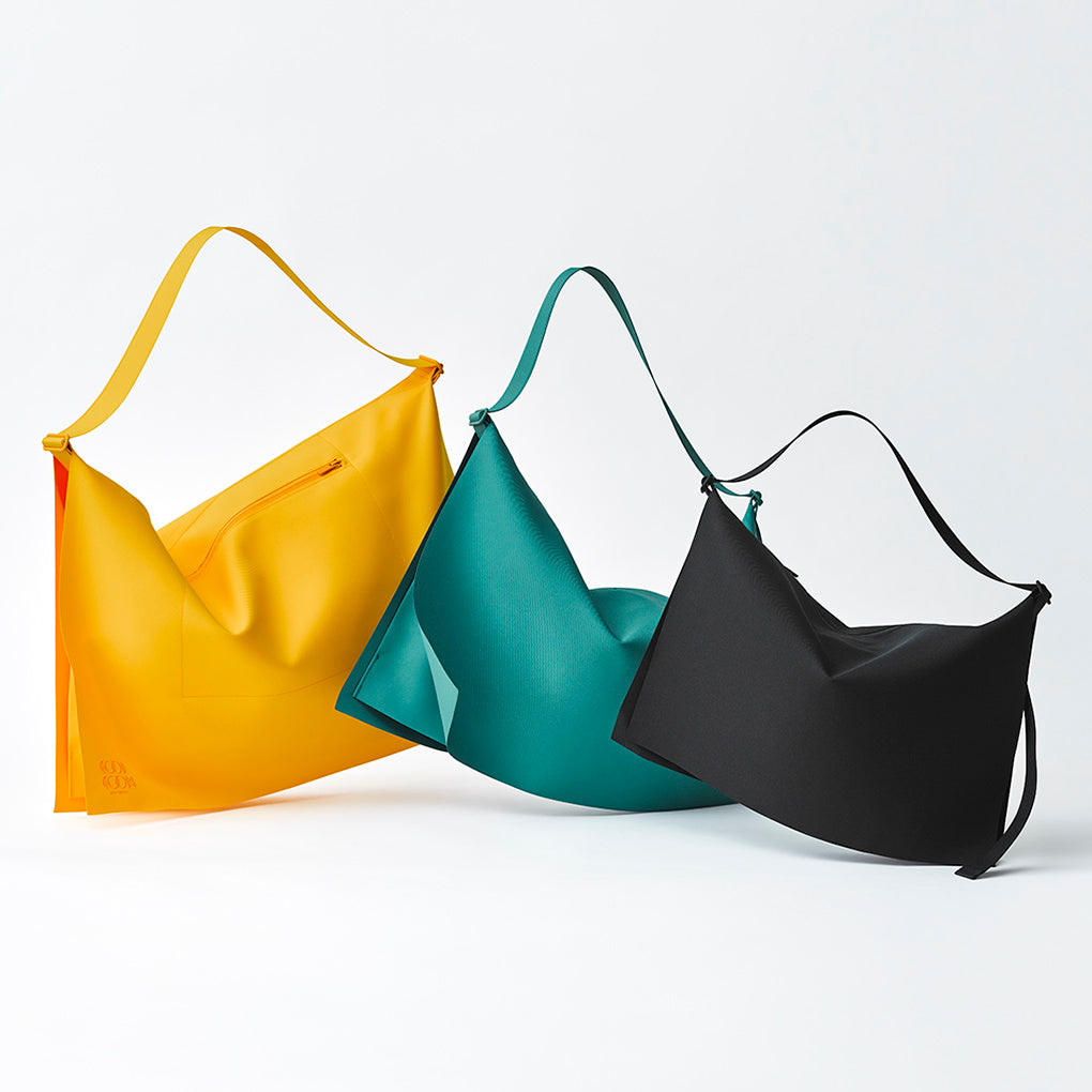 This series of shoulder bags is made by cutting out rectangles directly from the roll of fabric. Using laser cutting technology and simple sewing allows for the original lightness of the fabric to be enhanced. The flat construction of “ROLL” makes it feel like an extension of clothing, and it can be easily rolled up and stored like a poster.