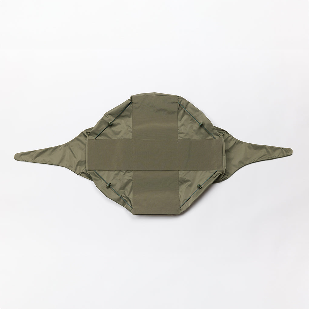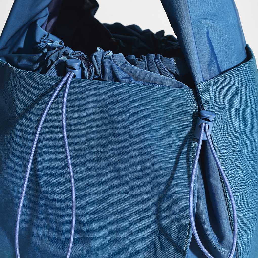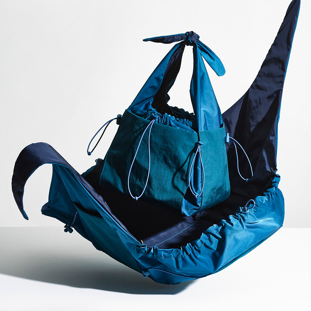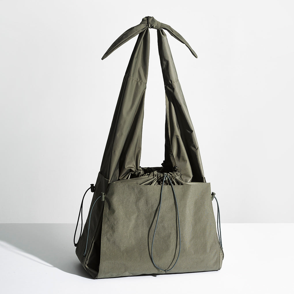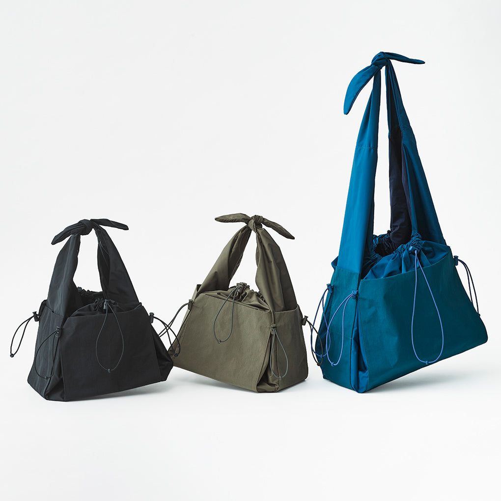 This nylon series of bags is created by rethinking the simple function of cloth, “to wrap and carry things”. The way it changes its shape from flat to three-dimensional by pulling the string is reminiscent of traditional Japanese wrapping cloth, furoshiki. The bag has a freely adjustable front opening and features pockets on all four sides to make it easy to use and carry.