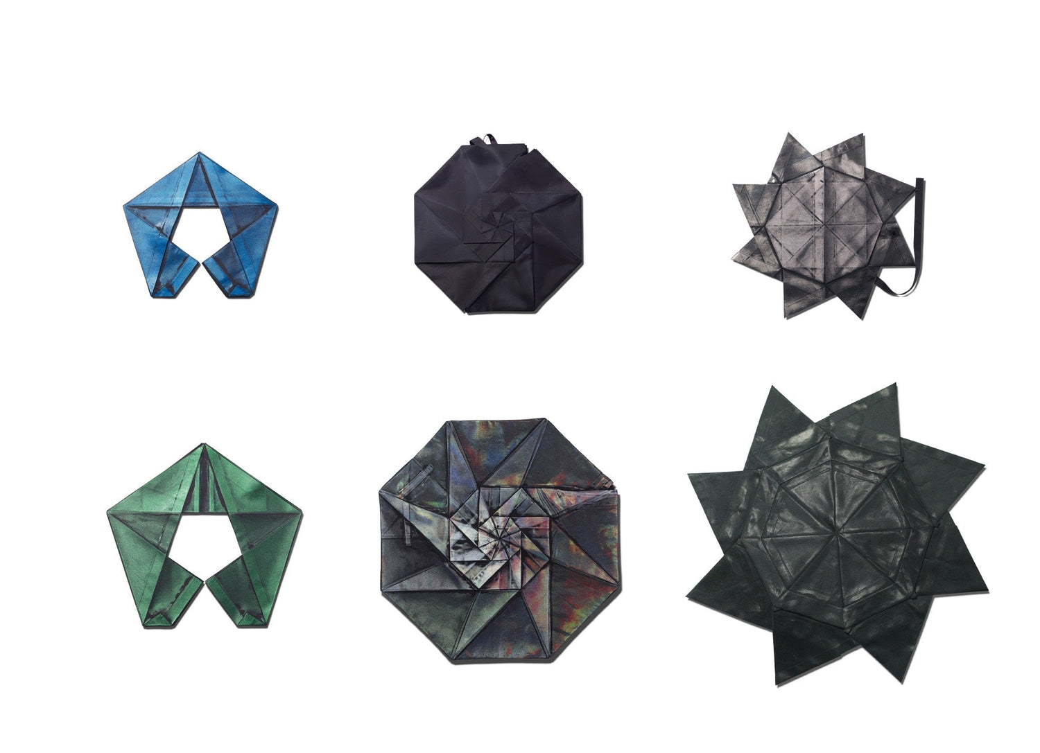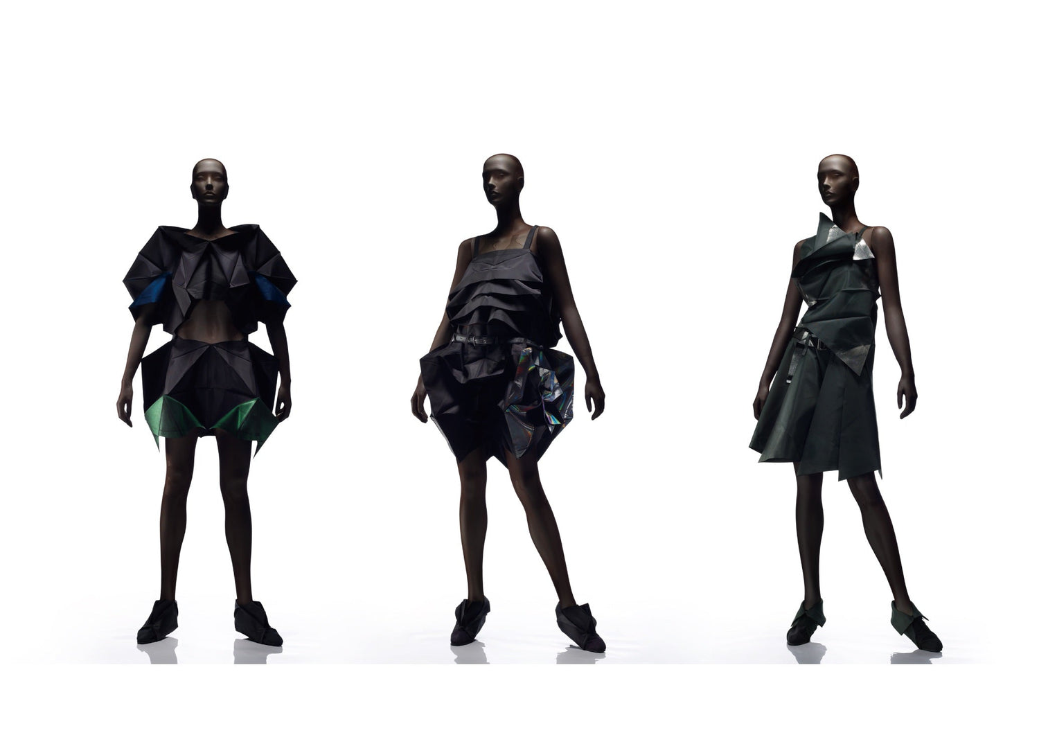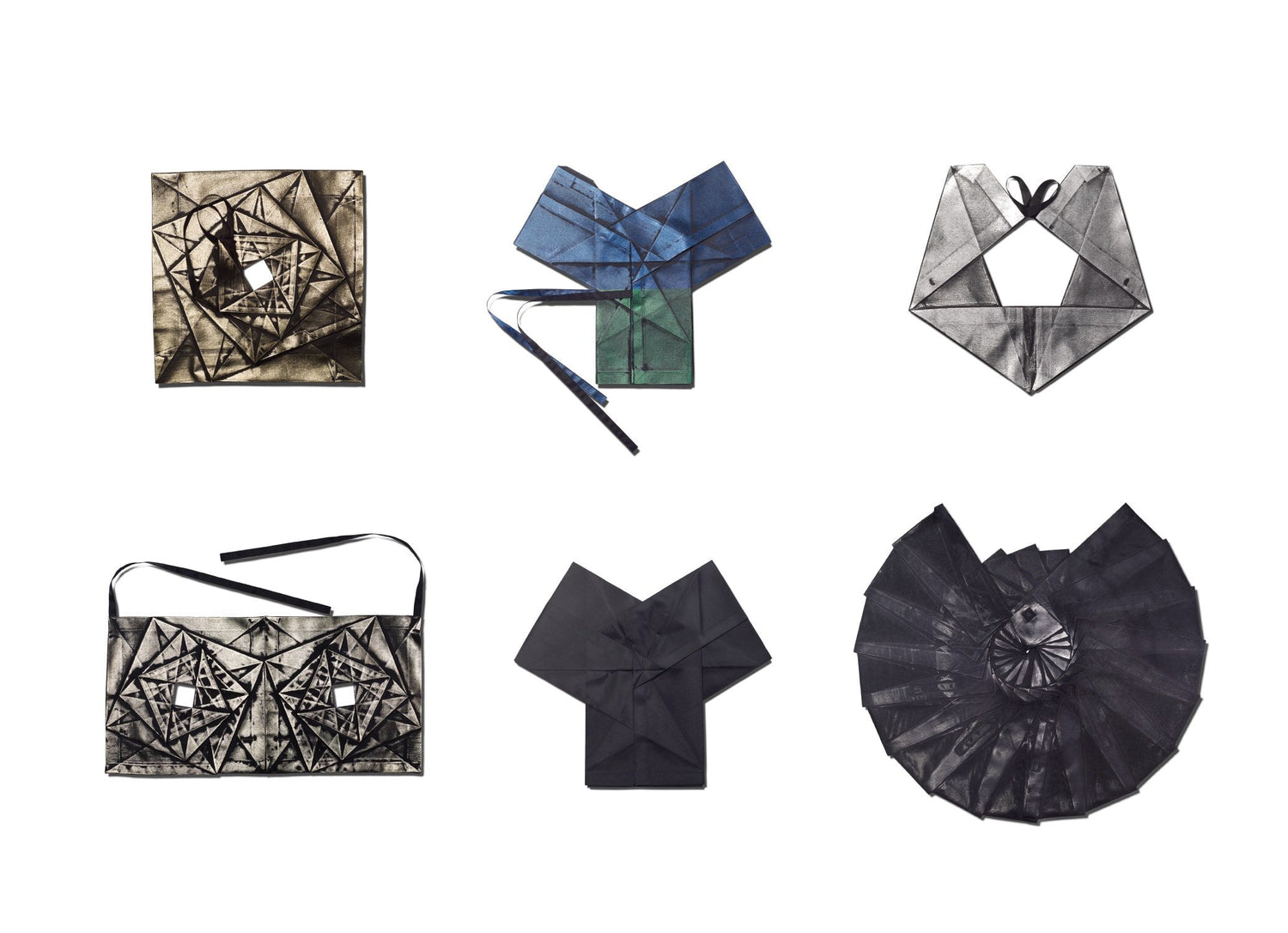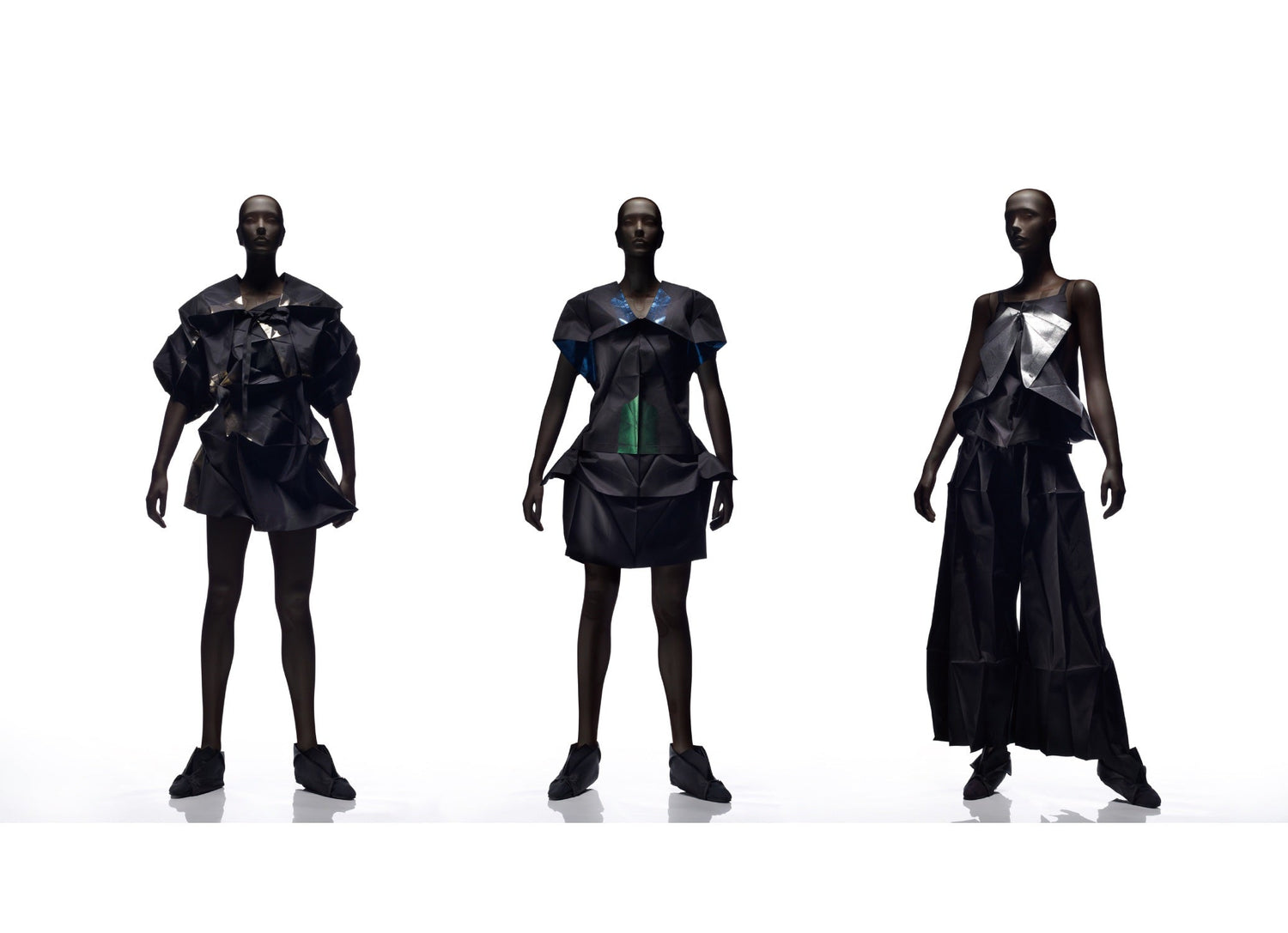 To make original clothing, Reality Lab. explored and studied three-dimensional structures that fold into flat surfaces and adapted them for unique clothing constructions, to be realized in recycled polyester fabrics that were products of numerous refinements.