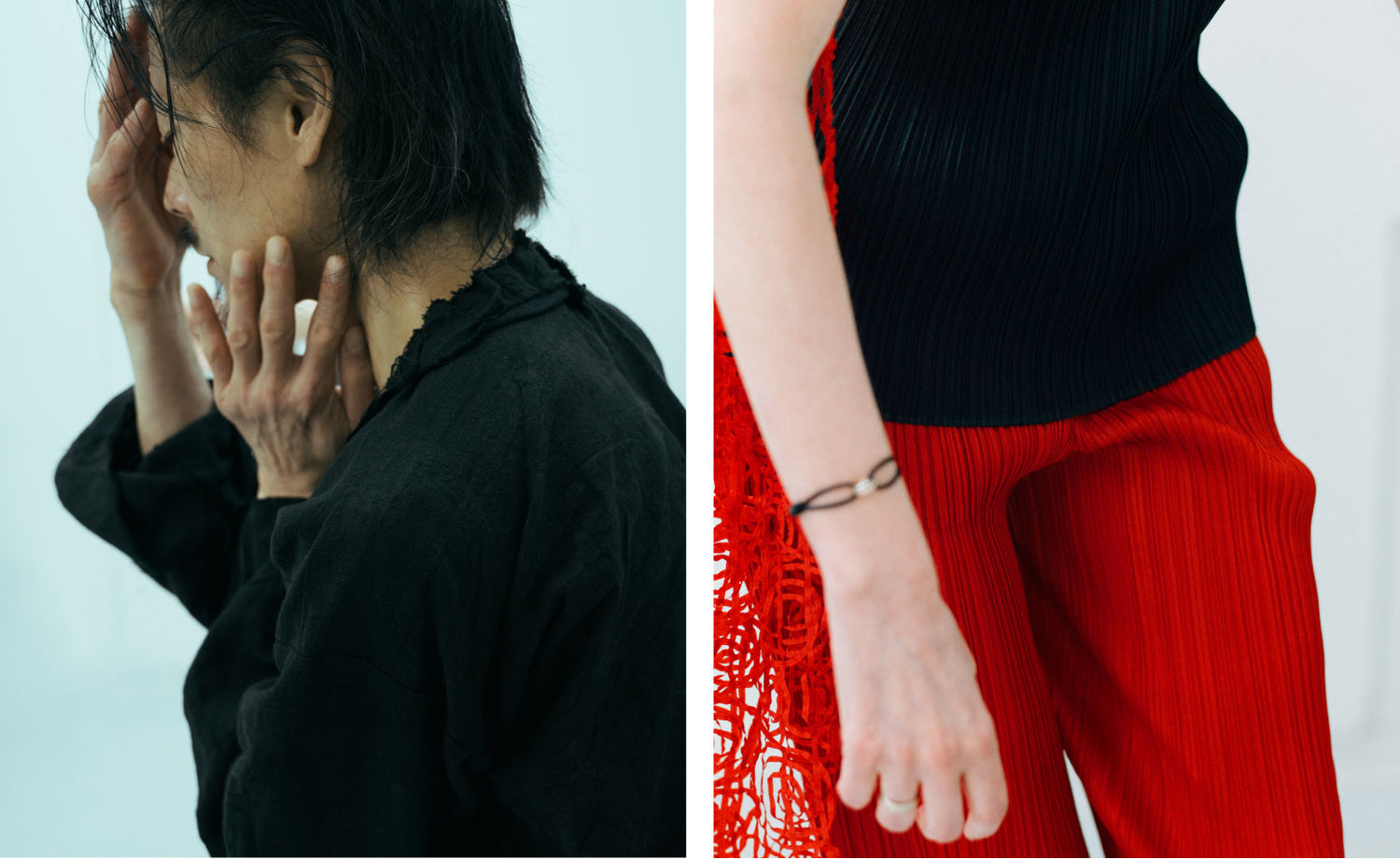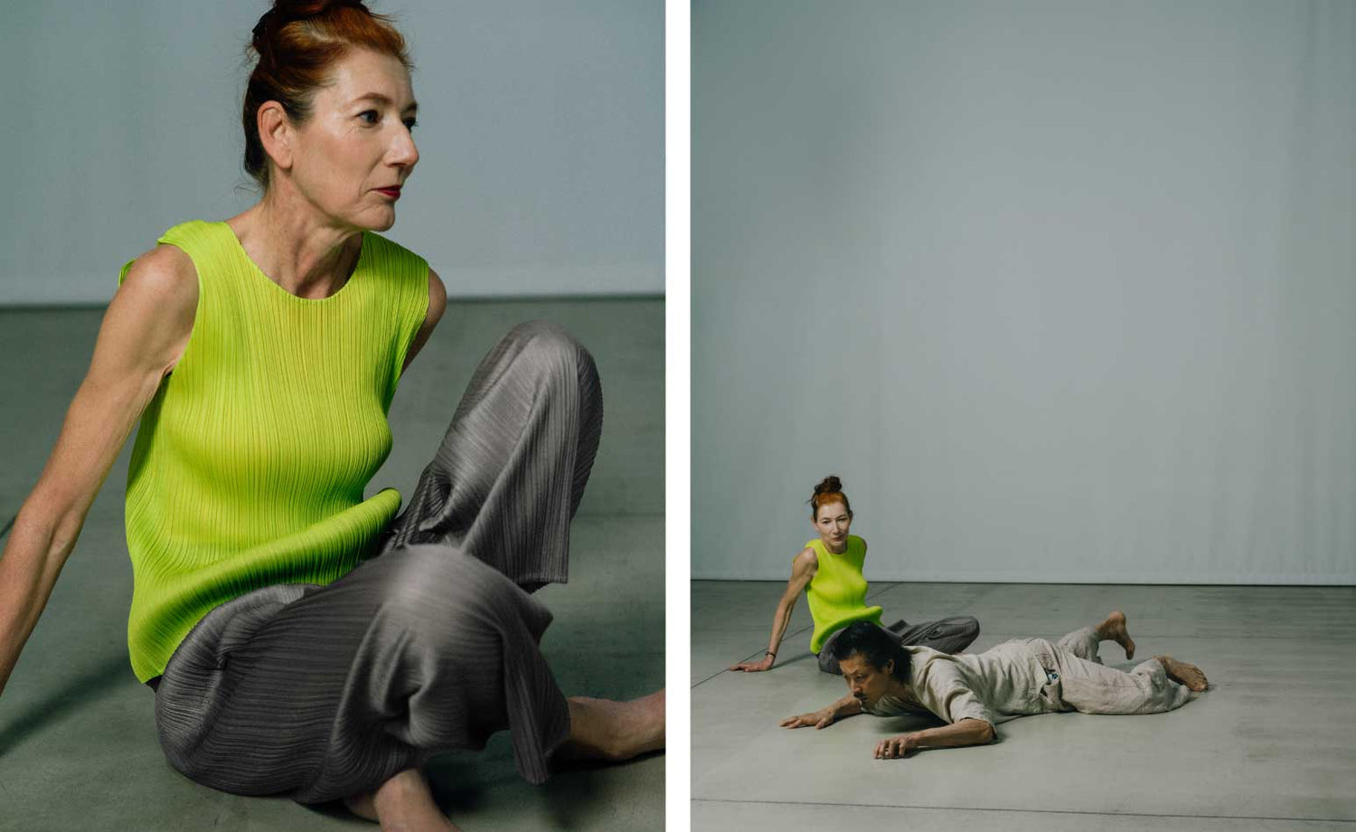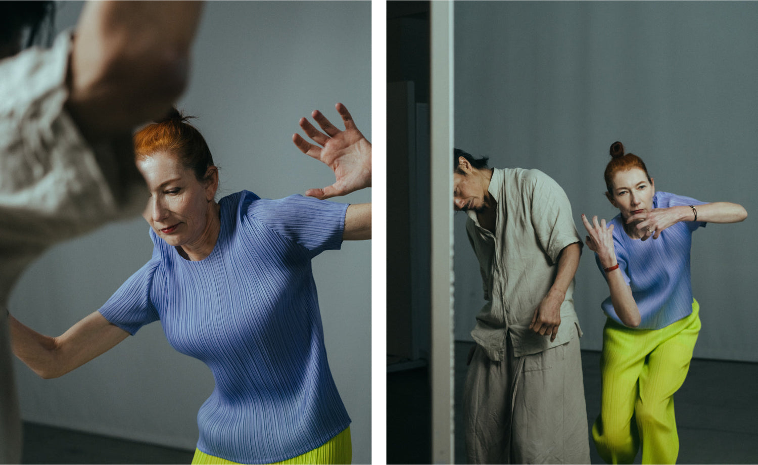 Knowing that Issey Miyake's costumes for William Forsythe and the Frankfurt Ballet were the beginning of PLEATS PLEASE, Hélène wanted, through the workshop, to evoke the origin of PLEATS PLEASE by wearing BASICS and NEW COLORFUL BASICS for all sessions.