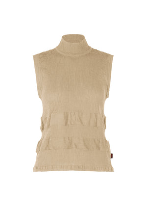 This KYO CHIJIMI sleeveless top is characterized by its light and supple texture. It is woven on a loom unique to the production area using ultra-fine cotton yarn that has been twisted more than regular hard-twist yarn. The uneven, three-dimensional feel and slim form were created by sewing together material with vertical and horizontal fabric grains.
