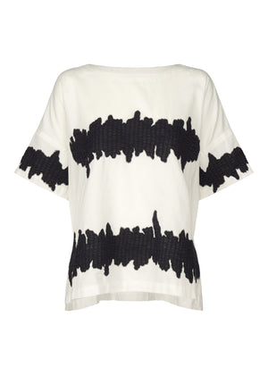 This short-sleeved top is made from cotton with a moderate sheen. Fine gathering is created by applying Kabira, Indian embroidery, at regular intervals to thin, soft gauze fabric. The gathered fabric is then cut into wave-like shapes and sewn on with machine embroidery.