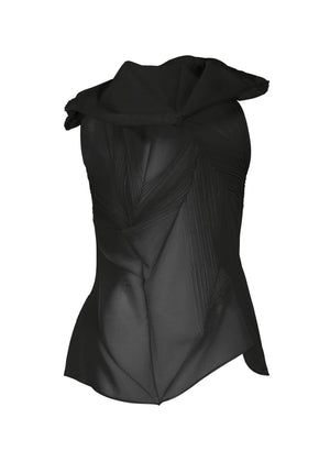 This sleeveless top with a distinctive silhouette combines linear folds with sharp pleats. The sheer, moderately taut fabric is made by alternating fine, sheer thread with polyester and ramie spun thread. By alternatively applying and omitting pleats to the material, a beautiful contrast was created between the material's soft, translucent quality reminiscent of Japanese Washi paper and the sculptural, structured form.