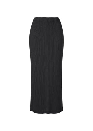 This long pleated skirt features the appearance of hatching, which looks like a scratched drawing. It is made from polyester with a textured finish that is dry to the touch. The texture is created by applying fine pleats twice.