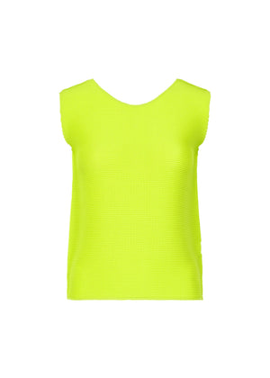 This round-neck, sleeveless top features vertical and horizontal stretch pleats.