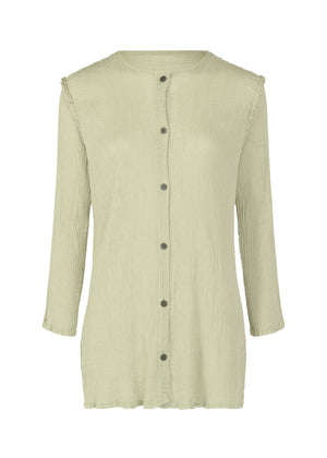 This SEE-THROUGH CREPE long-sleeved cardigan is made from product-dyed fabric that is woven using high-twist thread for the weft. The weft thread is twisted back during the dyeing process, which gives the fabric the unique look of crepe with vertical creases. It has slits on both sides.