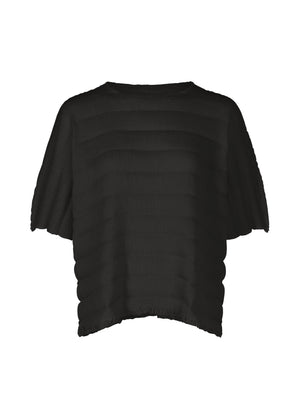 This SEE-THROUGH CREPE short-sleeved top is made from garment-dyed fabric that is woven using high-twist thread for the weft. The weft thread is twisted back during the dyeing process, which gives the fabric the unique look of crepe with vertical creases. The top is characterized by its springy silhouette due to the application of horizontal, semicircular handmade pleats after garment dyeing.