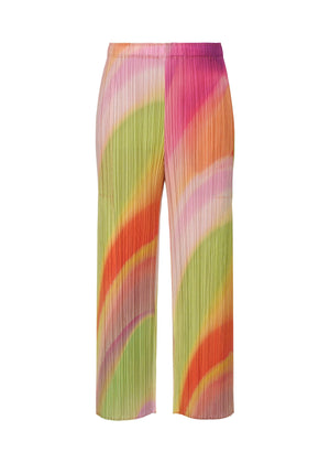 These wide pants feature a colorful gradation print inspired by groovy rhythmic waves. It is recommended to style them with solid-colored pleated items. They have pockets and slits on both sides.