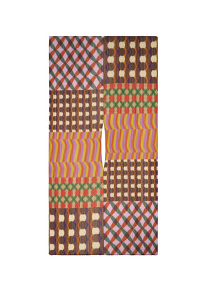 This large scarf features a print with geometric patterns that incorporate a list of combinations of various body movements, such as joining the hands, folding the arms, and crossing the legs. It has a hole in the center that allows your head to pass through for wear.