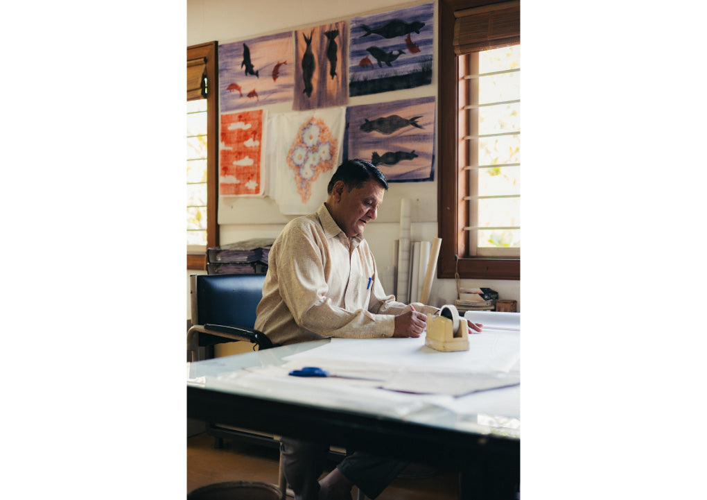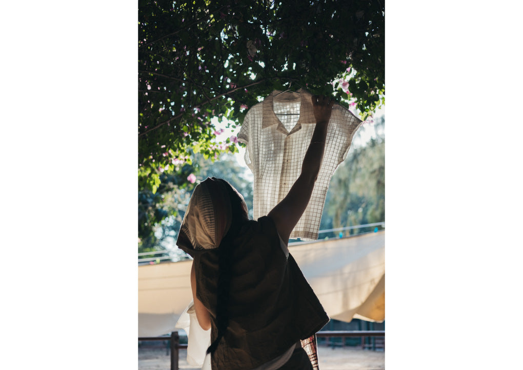 The origins of the HaaT series made in India, “HaaTH”, lie in ASHA BY MDS, which was launched in 1984. Made in collaboration with a workshop based in Ahmedabad, India, “HaaTH” presented clothing that was both luxurious and comfortable, made through a process of clothes-making that utilized local natural materials and delicate traditional techniques.