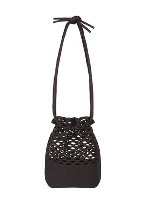 This drawstring bag-shaped shoulder bag has a casual elegance like a basket bag made from natural materials. The taut material feel and simple knitting pattern are expressed using twill knitting. The bag's corners are woven inside to create a bottom gusset, and the length of the shoulder strap can be adjusted based on where you tie it. The pattern varies depending on the color.