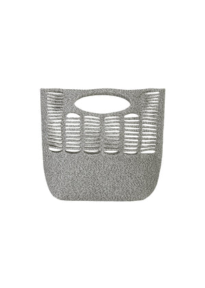 This colorful knit bag is made by intertwining thread in three colors to create mélange-style thread, and then knitting it in a twill pattern. The bag's corners are woven inside to create a bottom gusset.