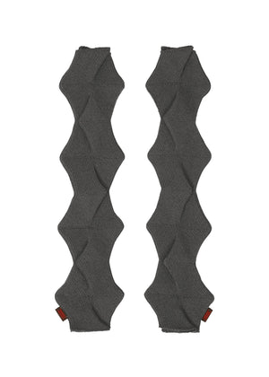These arm warmers are created using a zigzag knit fabric by applying the technique of ribbed short-row knitting. They are made with crisp, elastic thread blended from Australian wool and bright nylon.
