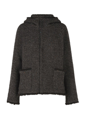 This hooded jacket is made from tweed material produced in Bishu. It is woven with a mix of various thread types and thicknesses in the warp and the weft, such as slub thread with irregular thickness, color-nep yarn with flecks of color, and loop thread. The loose weave and special finishing give it a soft texture. The fringe made with matching color-nep thread accent the jacket.