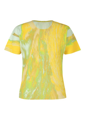 This round-neck, short-sleeved top is from a print series that uses paint to express the intricate layered beauty of the outside and inside of stones. The pattern, created by the accidental mixing of paints, gives a bold impression.