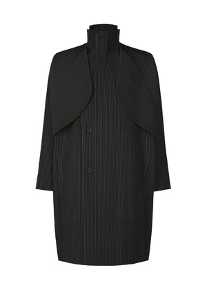 This coat features a striking design with a large overlapping yoke that extends from the shoulders to the back. The substantial yoke is characterized by its expressive looks that align with movement, allowing you to enjoy wearing it in various ways depending on your mood. The combination of three-dimensional pleating and architectural design creates an eye-catching style. It has pockets on both sides.
