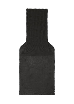 This knit stole is characterized by its dynamic silhouette created through partial flat pressing. By pressing thermoplastic synthetic fibers with a wool and alpaca blend thread, a crisp, rigid texture and subtle sheen not typically found in knitwear are achieved. Similar to sandwiching fillings in a panini, a mold is placed inside the garment during pressing, and the edges nothing is sandwiched are firmly fused as the knit fabric meets.