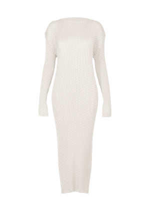 This round-neck, long-sleeved dress features pleated fabric with the beautiful sheen of refined satin. Although it is made from polyester fiber, it is characterized by its delicate, glossy texture, made by mimicking the fiber structure of silk using cutting-edge technology. It is pleated twice and designed to have a simple silhouette that moderately hugs the body.
