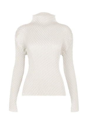This high-neck, long-sleeved top features pleated fabric with the beautiful sheen of refined satin. Although it is made from polyester fiber, it is characterized by its delicate, glossy texture, made by mimicking the fiber structure of silk using cutting-edge technology. It is pleated twice and designed to have a simple silhouette that moderately hugs the body.