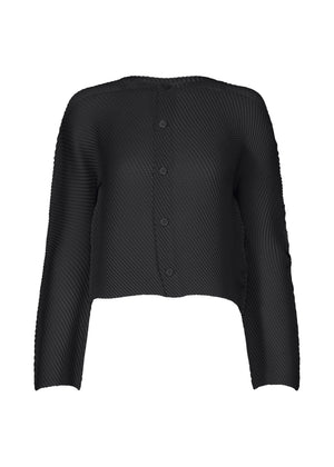 This cardigan is characterized by its soft fabric feel with two applications of pleats. Although it appears simple in design, the intentionally offset placement of torso and arm openings gives the cardigan an unusual form.