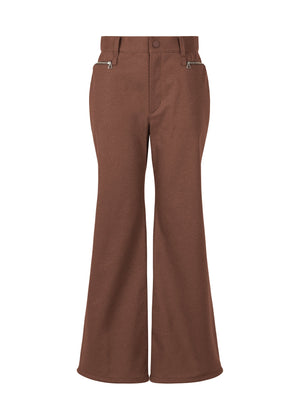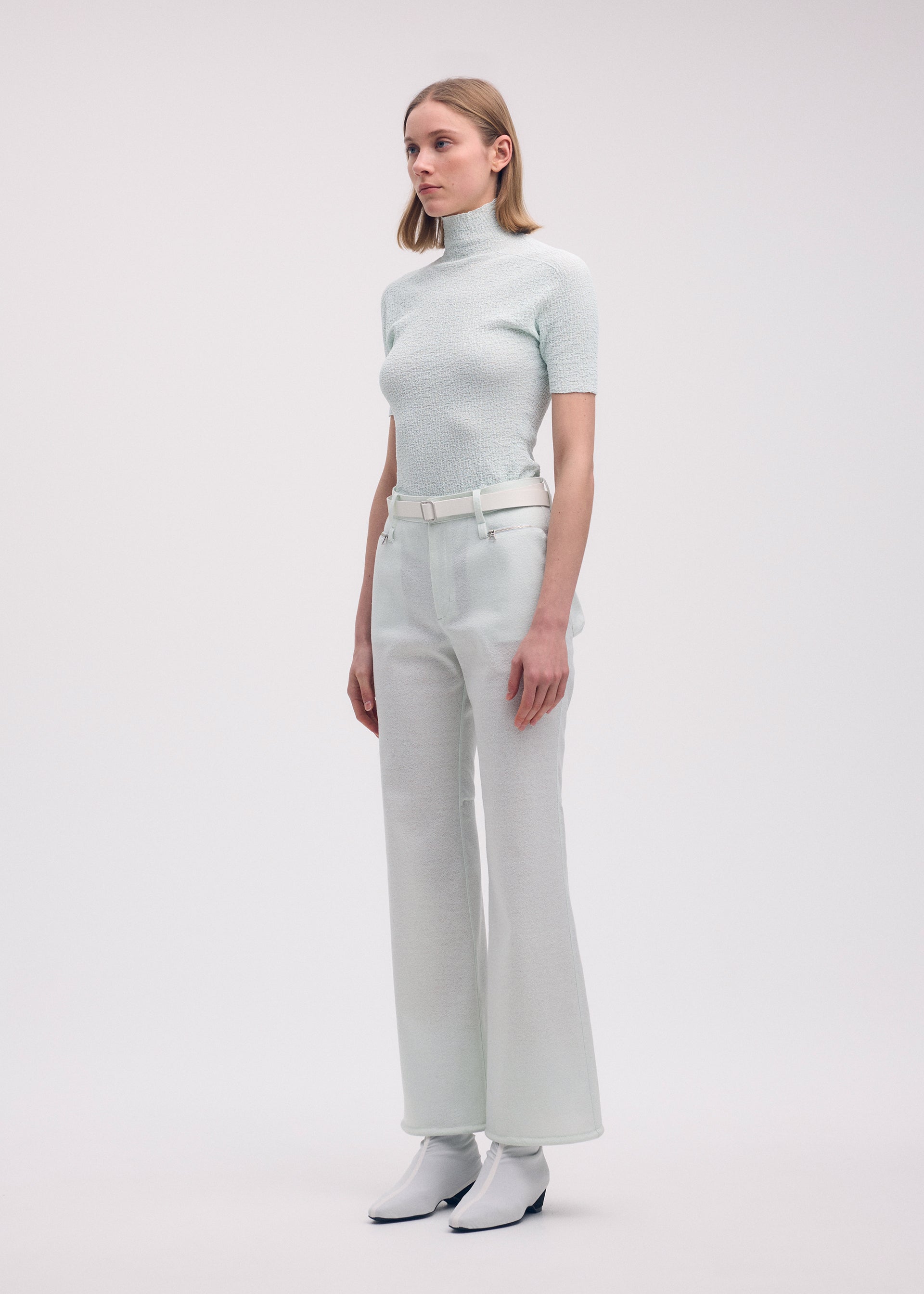 These pants are characterized by their form reminiscent of a garment bag. Featuring thick cords at the shoulders, yoke, and hem, the series features items with a form that gives the impression of wearing a garment bag. The highly expressive jersey fabric, made from a blend of polyester spun thread and wool thread, is fully resin-coated and pressed to add gloss and a taut feel. The lightweight, puffy material is deliberately processed to create a fabric with an entirely different look.