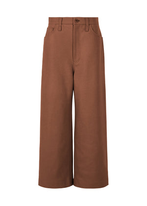 These pants feature deliberately unfinished beauty by leaving raw cut edges as they are. They are made from thick, wool-knit compressed jersey that has been given a resin coating which is then pressure-pressed to create a stiff, cardboard-like texture. Some parts of the garment have cut fabric edges that are left as-is.