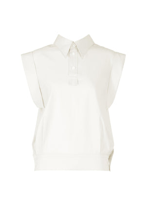 This sleeveless shirt is full of surprises, with a design that incorporates twists from every angle. While resembling a polo shirt, it features playful design elements such as the addition of collars at the armholes, which allows the shirt’s detailing to be appreciated even when viewed from the side. Unbuttoning the side and rotating it halfway transforms the body into sleeves, creating a short top. The high-twist cotton voile fabric gives it a non-clingy texture that feels comfortable against the skin. Wear it on its own to enjoy the versatile styling, or pair it with jackets and pants for an interesting outfit.