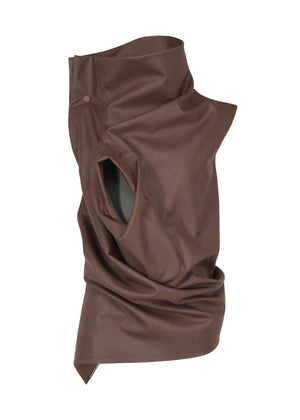 A sleeveless top made from a single pattern that features a playful design, incorporating elements such as shoe insoles and brand names. The “Peu Form” footwear line, developed jointly with Camper and presented in the Autumn Winter 2025/26 Collection, has been reinterpreted and translated into the form of garments. Artificial leather that looks and feels just like suede is given a leather-like embossed finish, creating a luxurious texture.