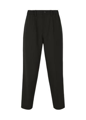 These pants are characterized by a sleek silhouette with a light, functional design that allows for ease of moment, made by hand-pleating both sides of the pants. Two types of yarn were dyed in different colors to create the wool-like woven material.