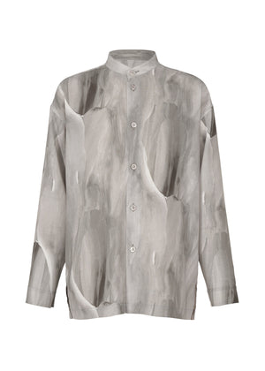 This long-sleeved shirt features a pattern that directly incorporates the textures and fun color blending of a drawing made with a painting knife. The textile pursues a light impression that matches the pattern.