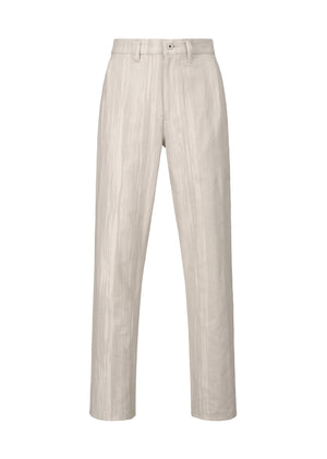 These straight pants are from a series woven on a jacquard loom, featuring a brushstroke-like pattern created by using different colors for the warp and weft threads. They are characterized by their puffy, soft feel.
