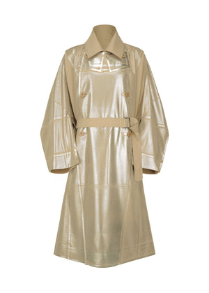 This coat is from a series inspired by ceramic artist Shoji Kamoda’s work “Square Bowl, Silver Glaze.” It recreates the bowl’s substantial texture using a textile finished with silver foil. Based on the “FLAT” series made with plant-based polyester, the coat was produced to become a rounded square shape when unfolded, like Kamoda’s square bowl when viewed from above. By applying foil not to the fabric itself but to the outer part of the garment in its flattened form, shading in the foil’s adhesion was created, expressing the subtle wavering of Kamoda’s bowl. In addition, like the bowl, which has a refined look with precise contours and sharp edges while still retaining traces of handwork, the coat is likewise finished with a natural form that is not overly linear.