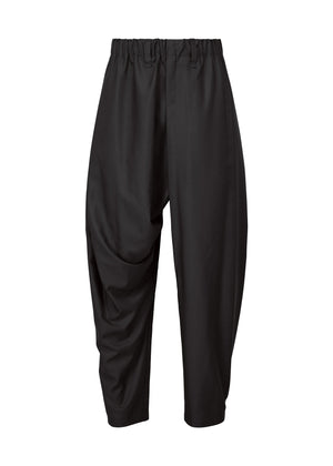 These unconventionally shaped pants are from a series that offers the lightweight experience of wearing a single piece of cloth. They are characterized by their loose silhouette and large range of motion when worn, born from a unique garment structure consisting of a single part. Made using a wrinkle-resistant textile that is easy to care for, they are designed to be easily incorporated into everyday life.