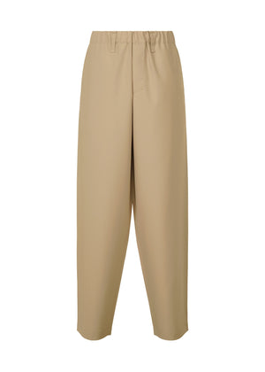 These pants are from a series that applies a technique to clothing designs in which three-dimensional items are folded completely flat. They can be carried compactly when folded and stored in the pocket located inside the hem. They are characterized by their easy-to-fold, wrinkle-resistant textile adapted to the design. The pressed lines serve as a guide to fold the pants for storage, and highlight the edges of the garment structure that hugs the body when worn.