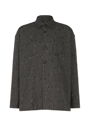 This long-sleeved shirt is inspired by the works of ceramic artist Shoji Kamoda. One of the jars created by Kamoda is densely covered with circular patterns drawn all over its surface, retaining a strong sense of the soil’s texture. To express the texture and look of this jar in textile form, the fabric is woven on a jacquard loom while changing the colors of the warp and weft threads to evoke the texture of cracked earth. The jar’s vivid glaze is expressed by twisting two slightly thicker cotton threads of different colors together with lamé threads of another color during weaving, highlighting luster and a three-dimensional quality. The pattern of this product varies from item to item. Please note this in advance.