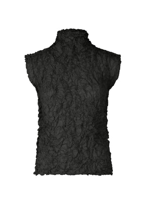 This sleeveless top is made from thin polyester material with a crushed and pleated finish, giving it a three-dimensional look. The lightweight, compact design makes it easy to carry and highly functional. There are slits on both sides.