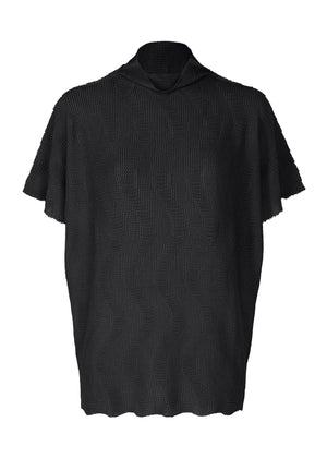 This KNIT STRETCH PLEATS high-neck top with French sleeves is characterized by its comfortable feel due to the soft-textured knit material featuring fine vertical and horizontal pleats that allow it to stretch in all directions. The wave-like look was created by pleating the top while swaying it from side to side. The moderately relaxed silhouette with dolman sleeves accentuates the wavy design.