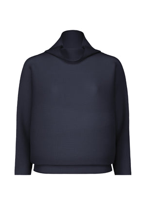 This STRETCH PLEATS stretchy high-neck, long-sleeved top features vertical and horizontal pleats. It offers relaxed comfort with dolman sleeves. After pleating, the fabric is turned inside out to create a three-dimensional silhouette.