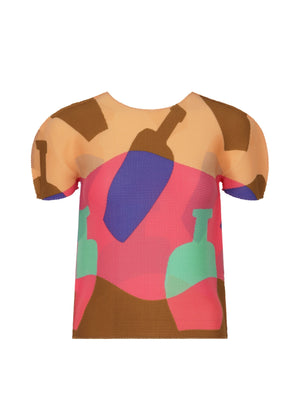This STRETCH PLEATS round-neck, short-sleeved, stretchy top features vertical and horizontal pleats. The print uses papercutting art to express glass bottles floating in the sea.