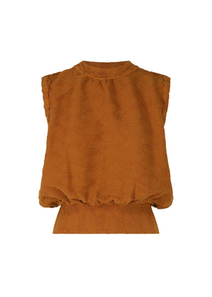 This sleeveless top is made from cotton blend material with a knit-like three-dimensional feel and stretchiness, created using the jacquard technique. The rib-like design at the hem is expressed through the difference in shrinkage created by sewing together fabrics with different grain directions and dyeing the garments. This comfortable item bounces back when stretched to retain its shape.