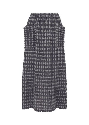This warm skirt features diamond-patterned flock printing on CAULIFLOWER material, which is characterized by its comfortable feel unique to cotton and its stretchy, uneven texture.