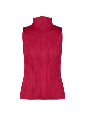 This sleeveless pleated top has a slim shape and wide mock neck.