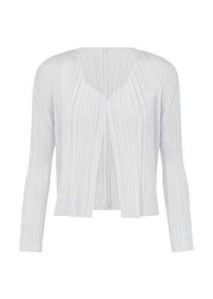 A short cardigan with random pleats applied to it. This is a basic seasonless item.