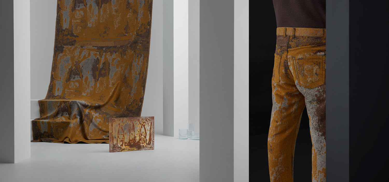 Denim jeans have become an indispensable part of our modern lives. They are garments that soften and change color each time they are worn. These are valuable changes that enable the wearer to look back and savor the time and experiences they have accumulated while wearing them. A-POC ABLE ISSEY MIYAKE detected new value in what Kano was bringing to rust and its high affinity with jeans, which brought this project to fruition.